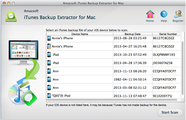 Download and install the Mac program. After running it, you ought to see a list as below, which contains all the iTunes backup records on your Mac computer. If not, you may haven't do any sync before. Choose the one belong to your iPhone and click the button of "Start Scan" to let it scan on your iPhone's backup.