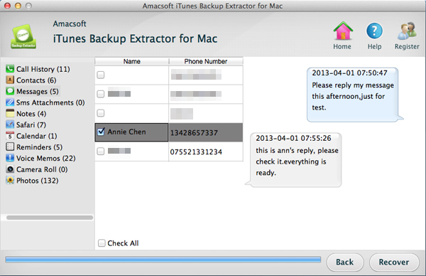 Got it? More functions are included in the Amacsoft iTunes Backup Extractor for Mac, such as extract and recover contacts, photos, call history, notes, voice memos, calendars and more. Explore more features of it by clicking the below download buttons.