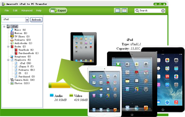 * Enables you to transfer multiple types of files like music, movies, TV shows, contacts, notes, safari bookmarks, podcast, ringtone, ePub, PDF, audio books, camera roll, picture, voice memos and more from iPad to computer.