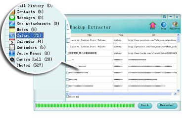 * Almost all data types on your iDevice can be scanned out and extracted by this software, such as photos, videos in camera roll, audios in voice memos, SMS attachments and text files inclulding contacts, messages (including SMS attachment), call history, calendar, notes, reminders and Safari bookmark.